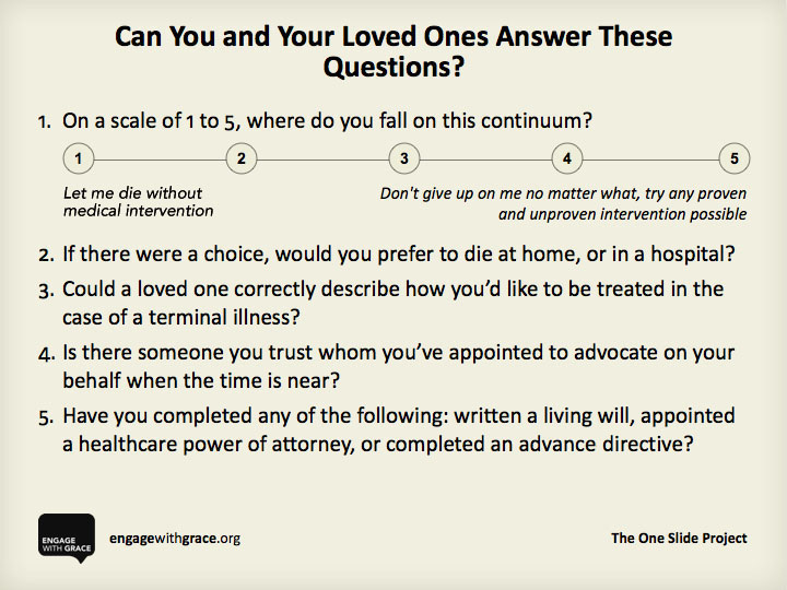 At the heart of Engage With Grace are five questions designed to get the conversation about end-of-life started.